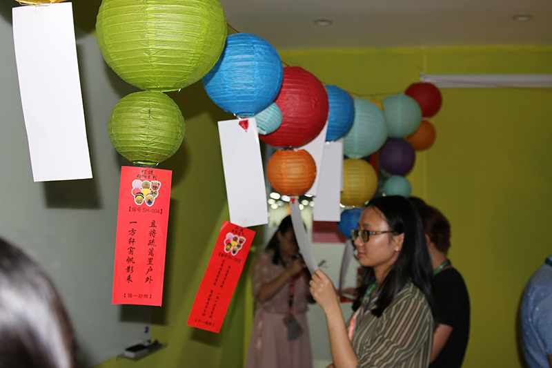 弹壁灯贴三面题,摩肩搭背来猜谜。本似前朝射覆事,文思机敏方解疑。喜庆的灯笼映着阑珊的灯火,营造出了既温馨又浪漫的气氛,引来了众多的妹子前来围观。